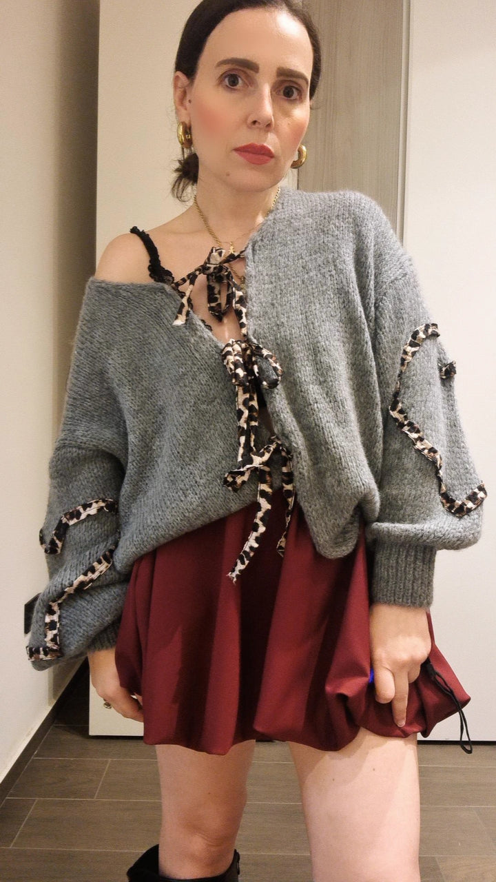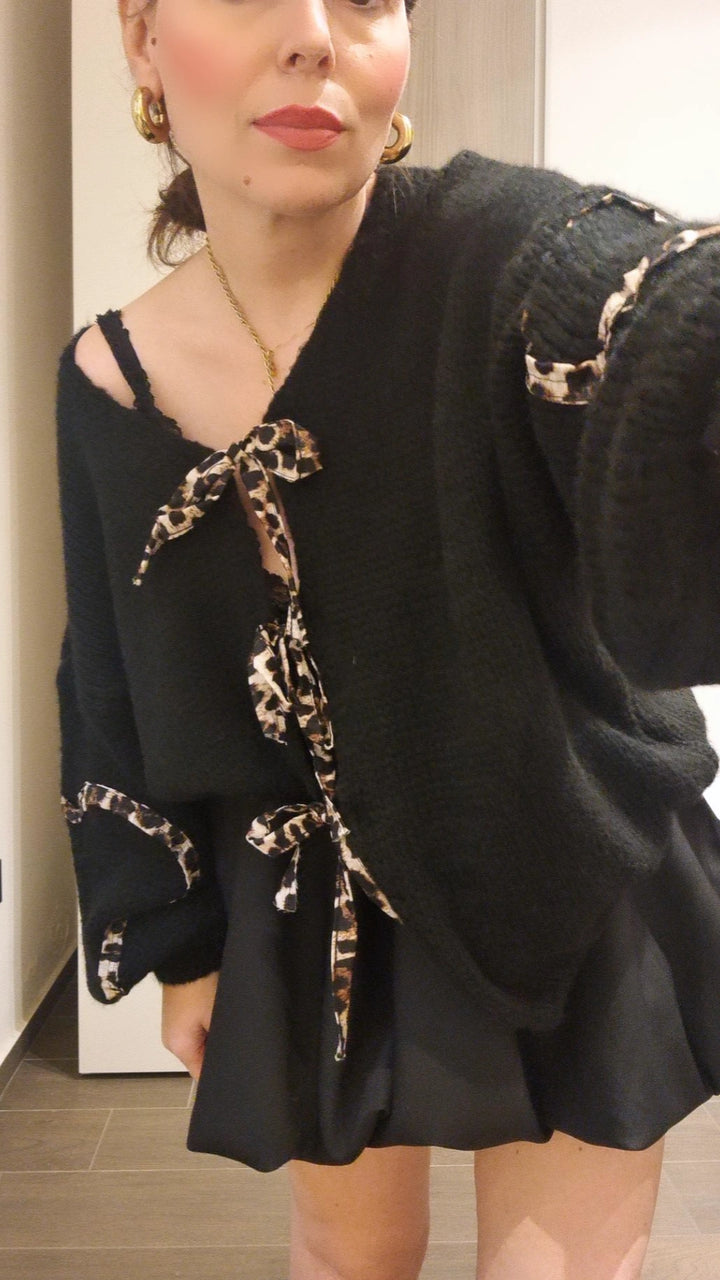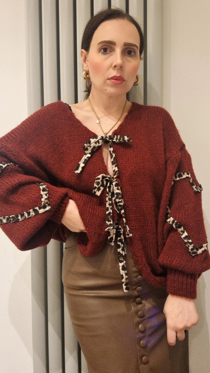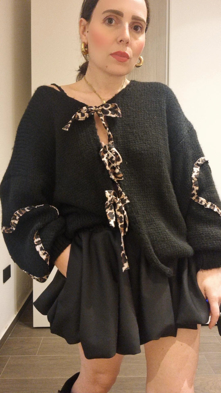 Cardigan in maglia con fiocchetti sul davanti e cuori ai gomiti in tessuto leopardato