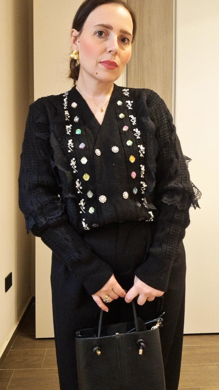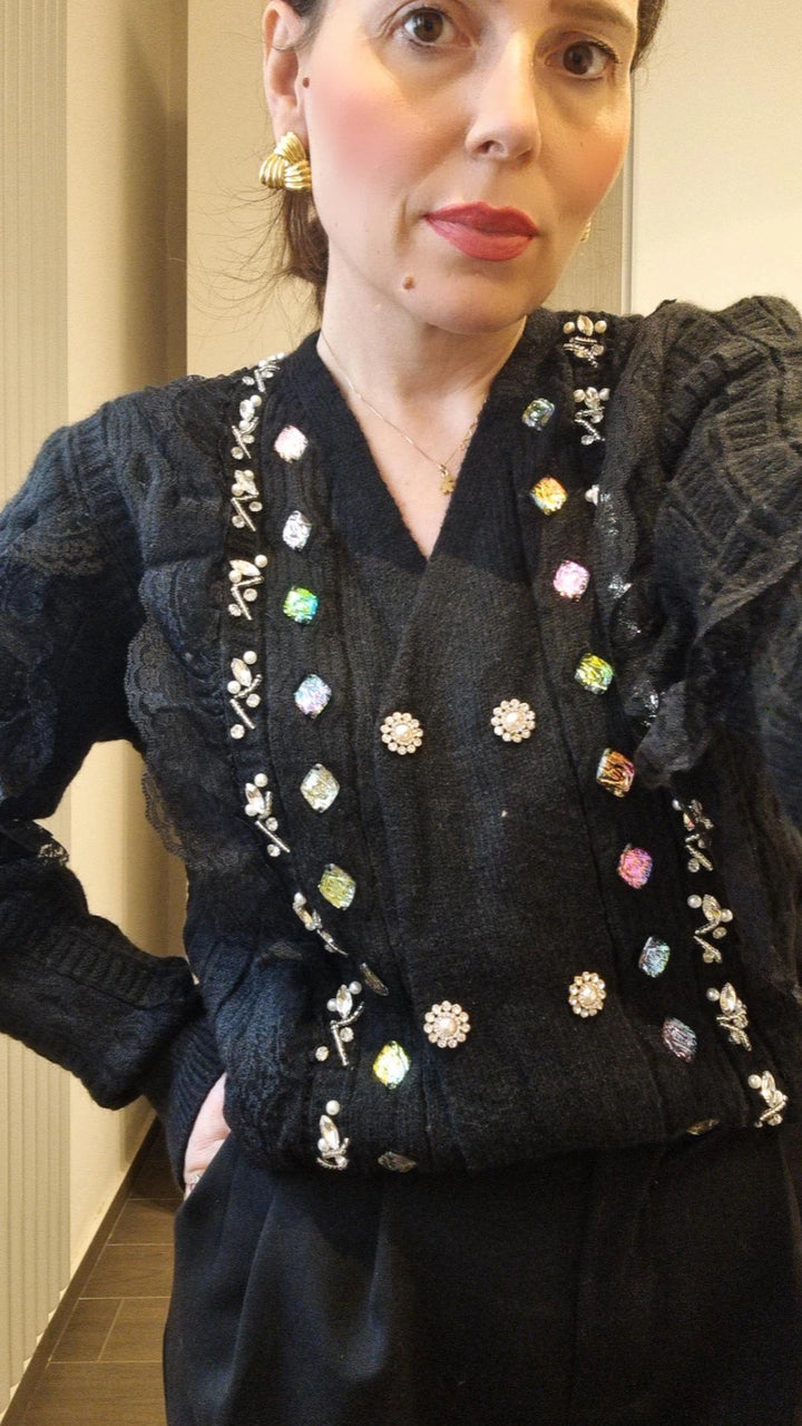 Cardigan in maglia tricot con applicazioni di pizzo e pietre