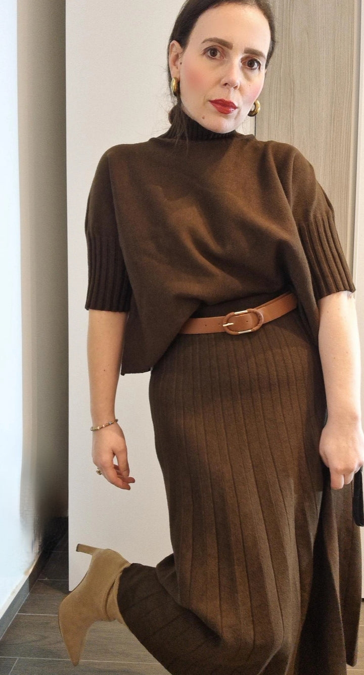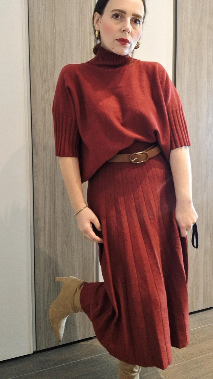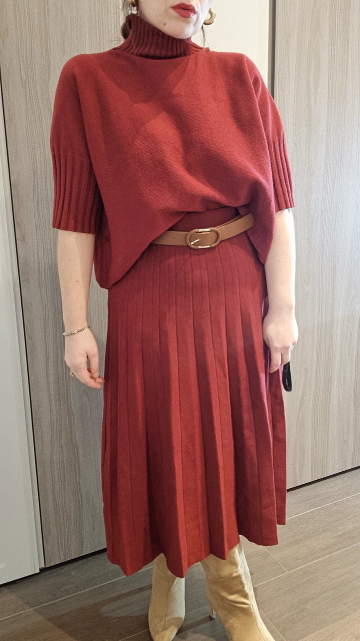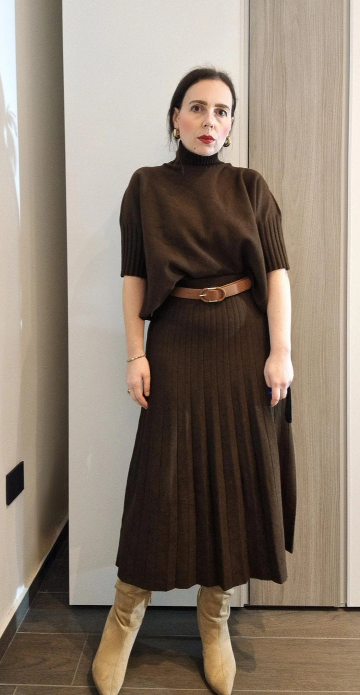 Coordinato in maglia con gonna 7/8 plissé in tessuto elastico