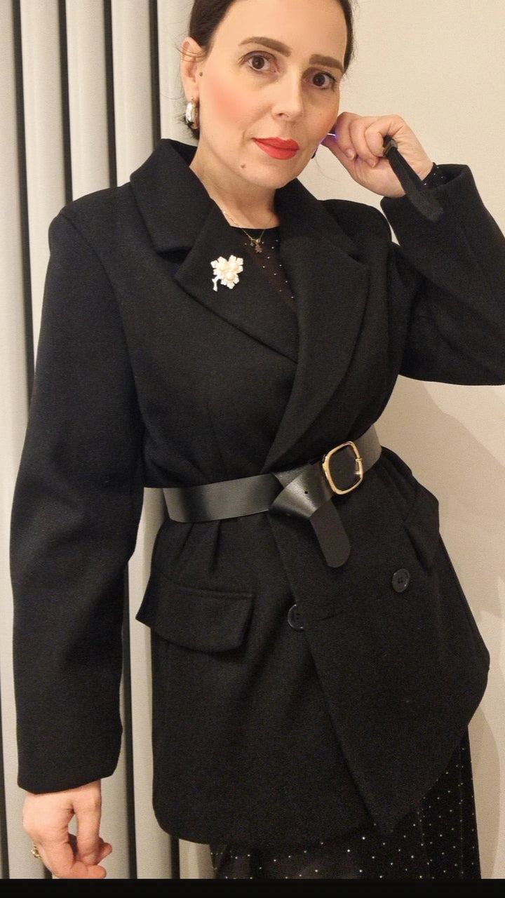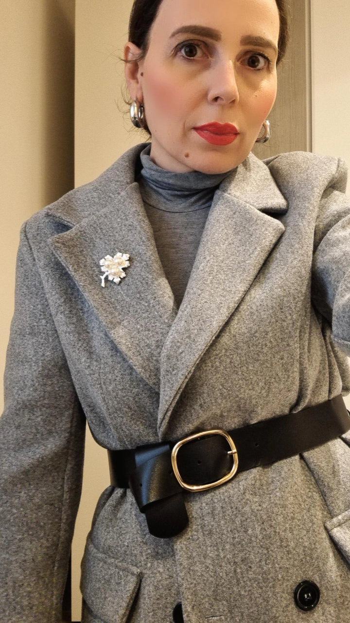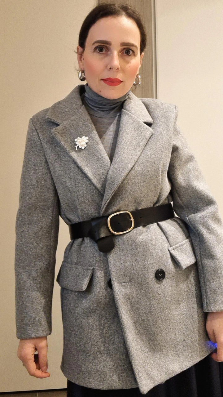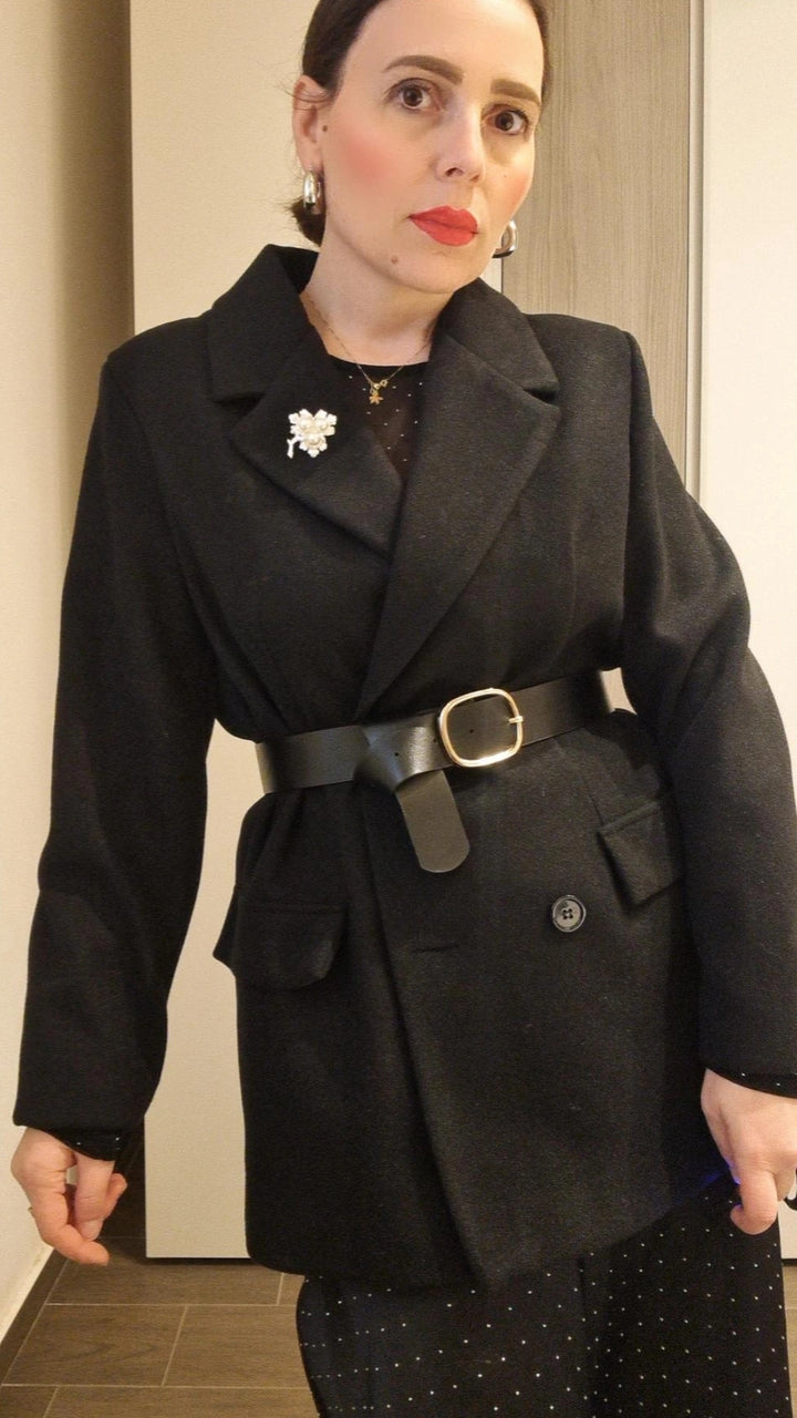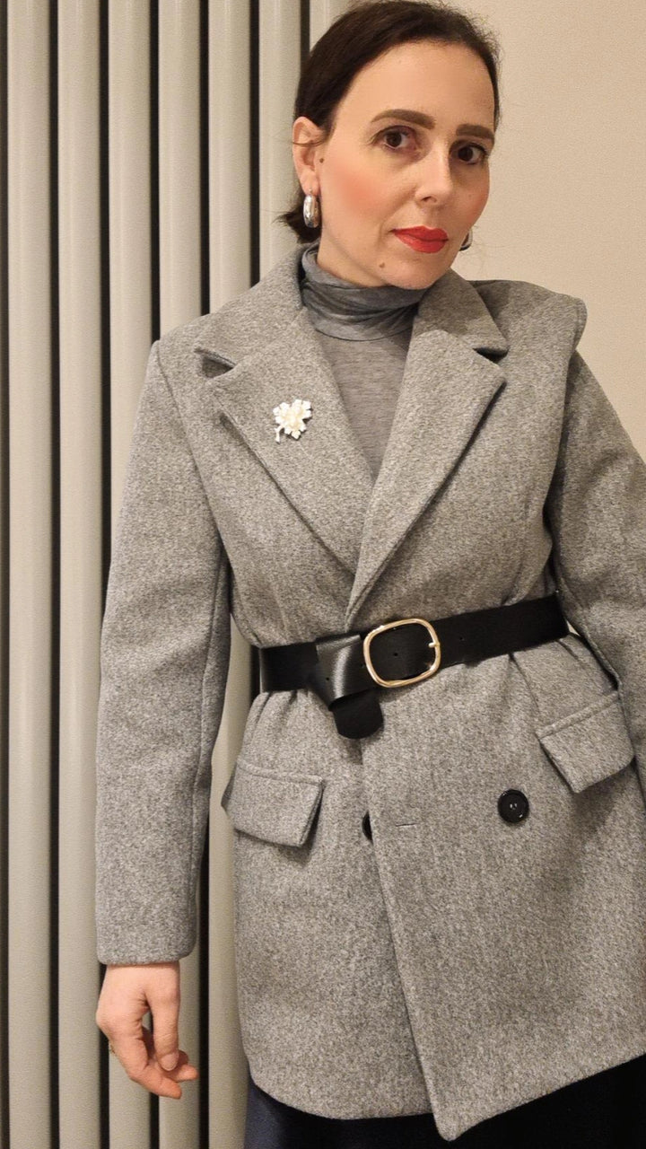 Giacca in lanetta doppiopetto con cintura in vita e spilla
