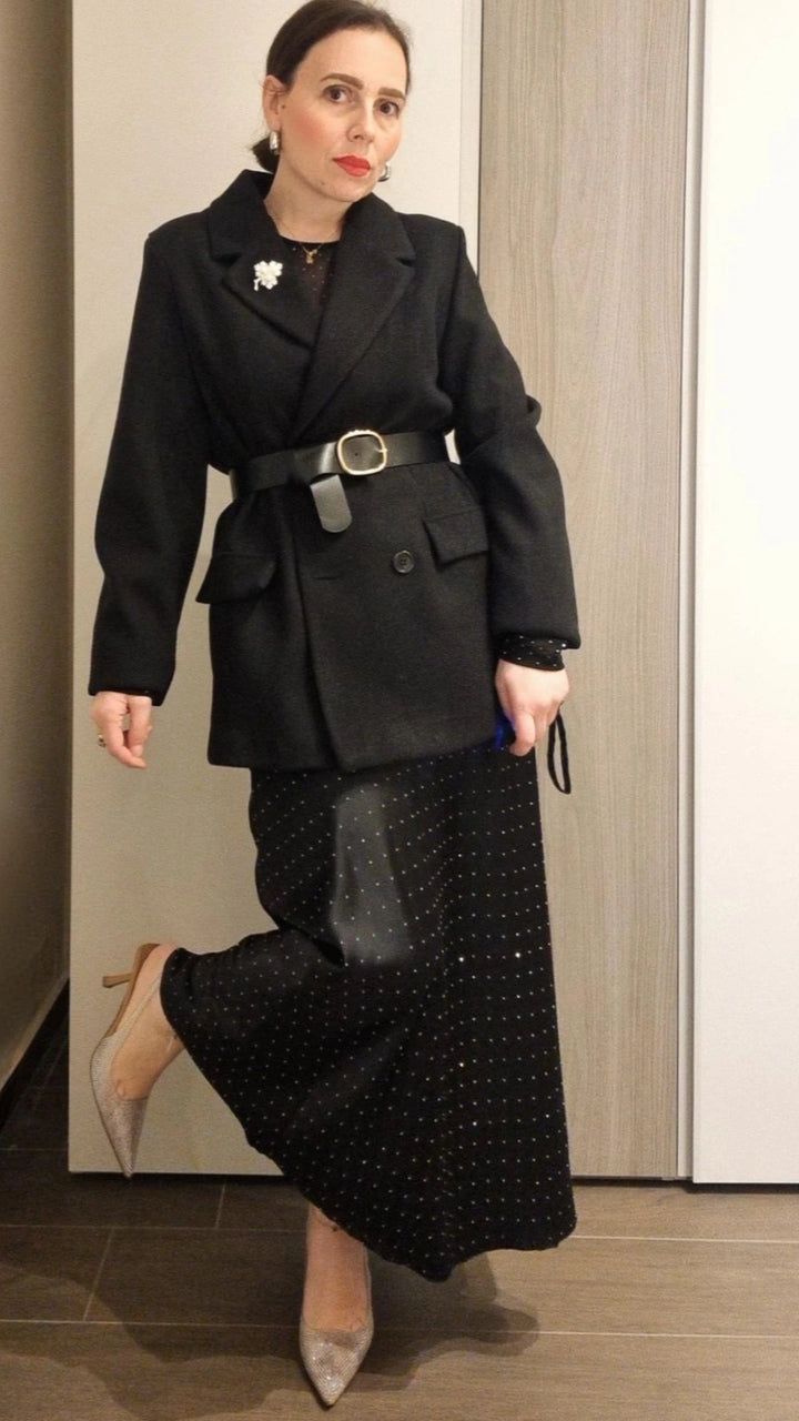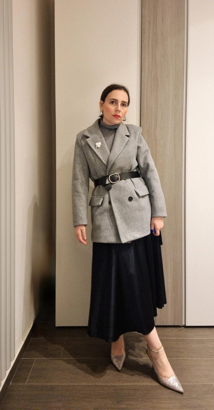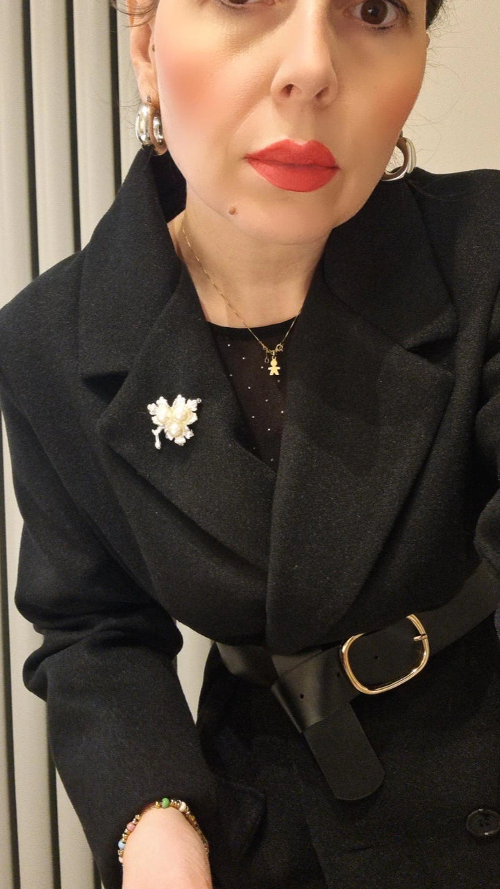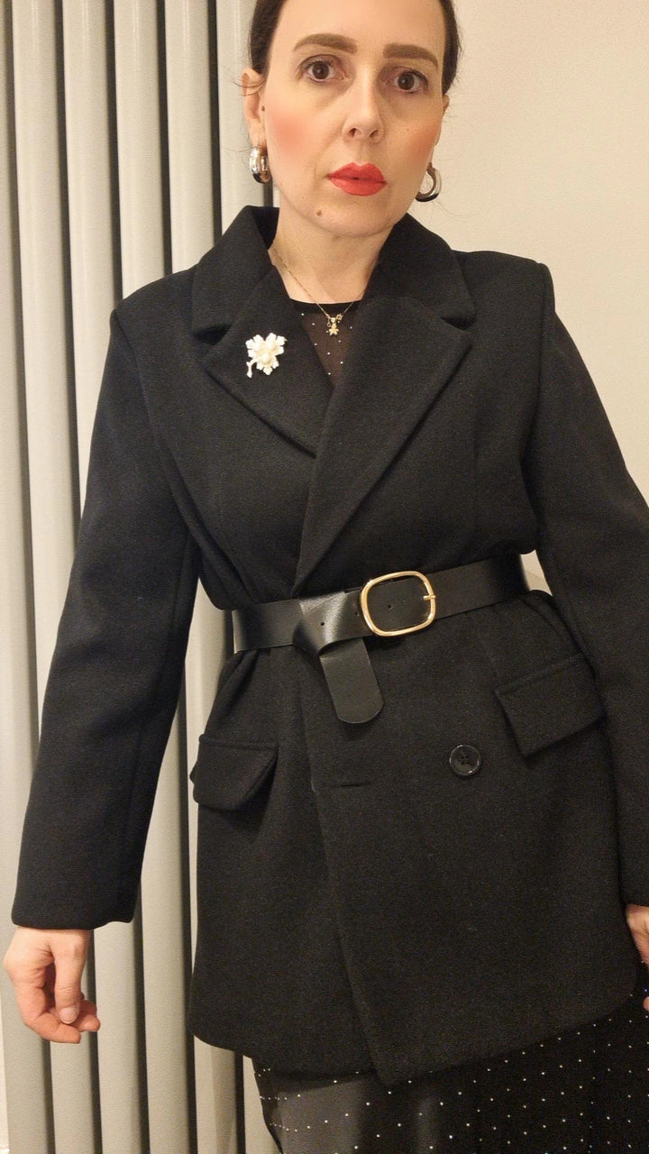 Giacca in lanetta doppiopetto con cintura in vita e spilla